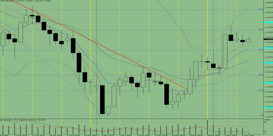 Трендовый анализ (рис. 1). Во вторник рынок от уровня 1.3317 (закрытие вчерашней дневной свечи), может начать движение вверх, с целью 1.3367 – откатный уровень 50% (синяя пунктирная линия).При тестировании этого уровня цена, возможно, начнёт движение вниз, с целью 1.3345 – верхний фрактал (дневная свеча от 08.12.2025 года). Рис. 1 (дневной график). Комплексный анализ: - индикаторный анализ – вверх;- объёмы – вверх;- свечной анализ – вверх;- трендовый анализ – вверх;- линии Боллинджера – вверх;- недельный график -