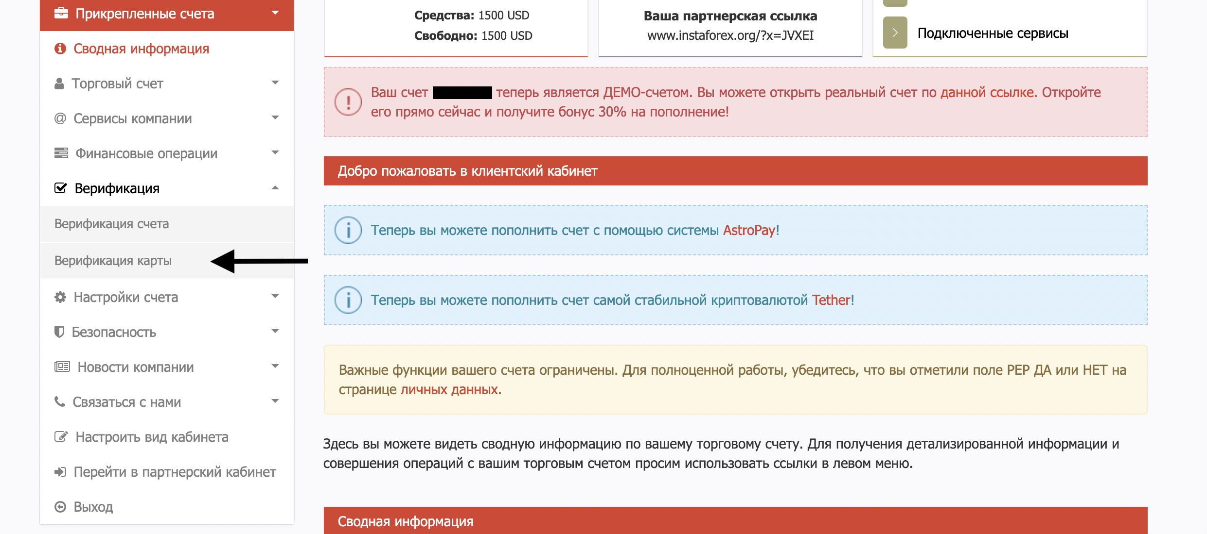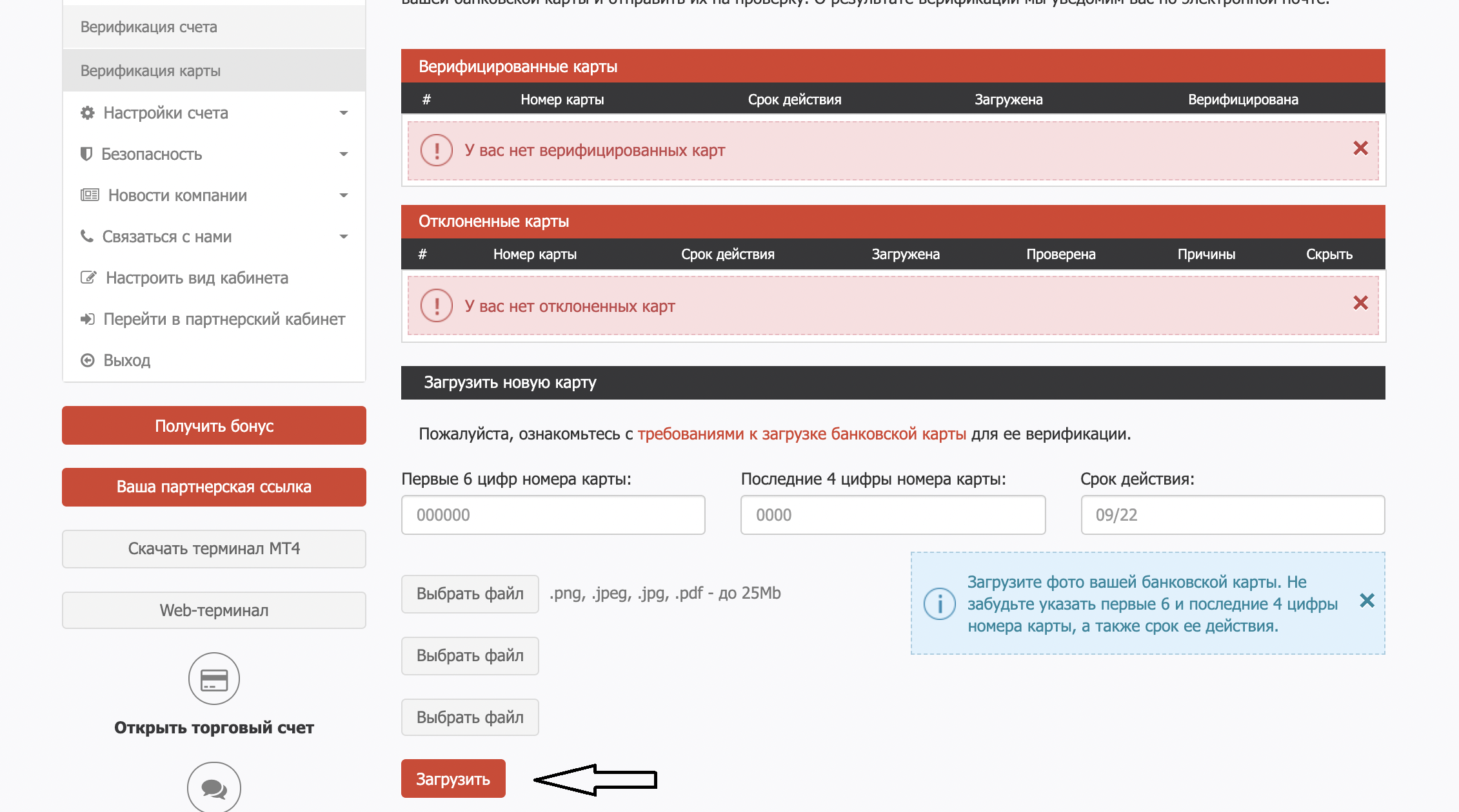 Пожалуйста, войдите в кабинет клиента своего торгового счета, в левом меню выберите Верификация, затем Верификация карты. На открывшейся странице вы сможете загрузить фото лицевой и оборотной сторон карты. Обратите внимание на необходимость сокрытия сенситивных данных на фотографиях.